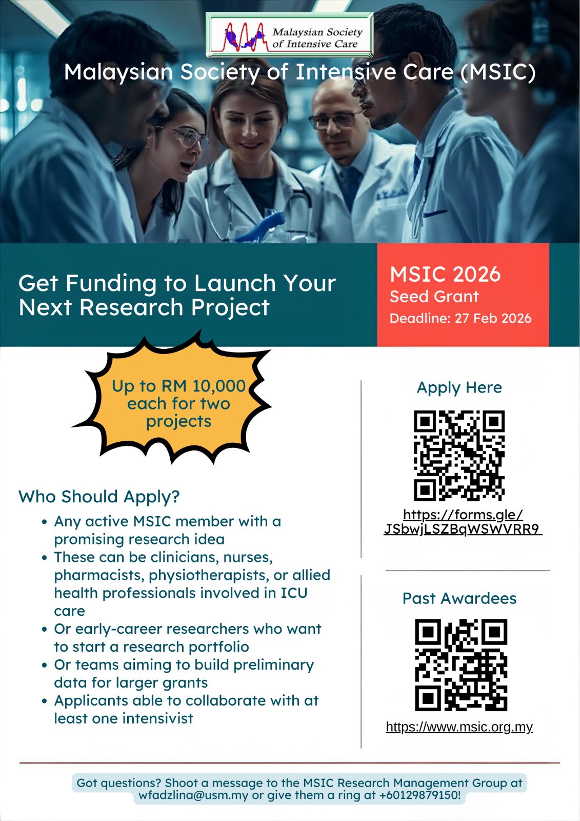 To boost intensive care research in Malaysia, the MSIC is pleased to invite applications for its 2026 Research Seed Grant.